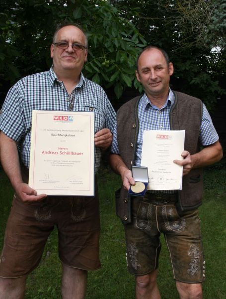 Seitens der Landesinnung der Rauchfangkehrer NÖ gratulierten KommR LIM Peter Engelbrechtsmüller, Bezirksinnungsmeister Stefan Schinnerl und Geschäftsführer Mag. Hannes Atzinger Herrn Andreas Schöllbauer für seine langjährige Tätigkeit als Arbeitgeber im Rauchfangkehrerhandwerk.